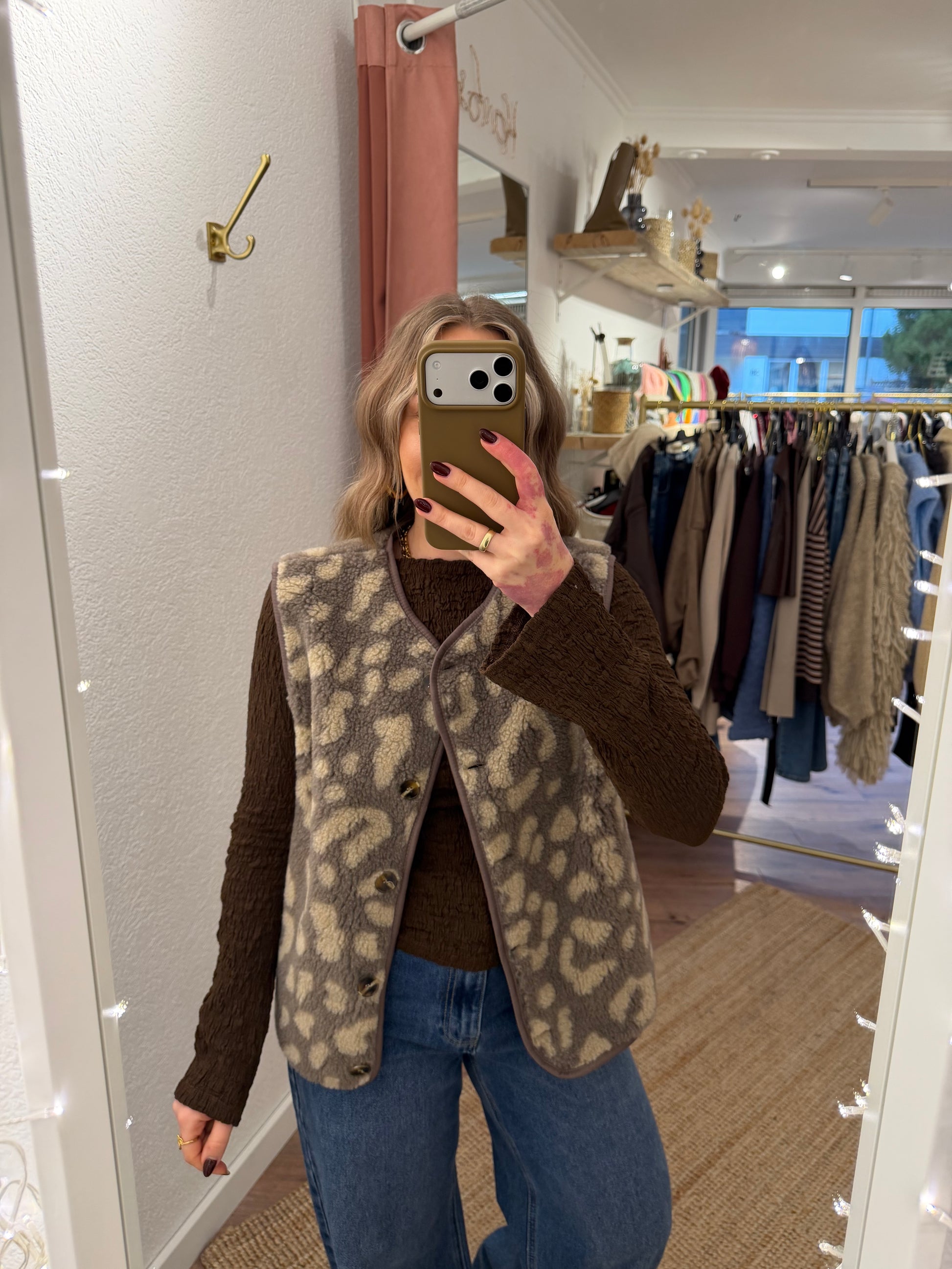 Kuschelige Teddyweste mit modernem Leo-Muster in Braun und Beige. Weiches Fleece mit glattem Innenfutter, Knopfleiste vorne und bequemer, hüftlanger Schnitt – ideal für stylische Layering-Looks an kühleren Tagen.